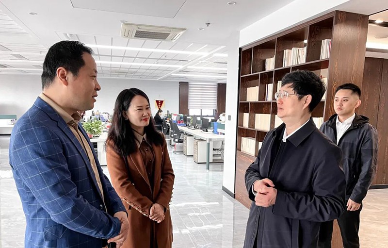 2024年3月15日上午,山东省工商联副主席郭建礼一行莅临德瑞克走访调研??姑裼笠怠翱萍佳蟹ⅰ⒋葱麓丛臁蔽魈獾拇笞叻么蟮餮谢疃?,了解民营企业发展和科技创新情况,为企业提供更精准的政策支持和指导。