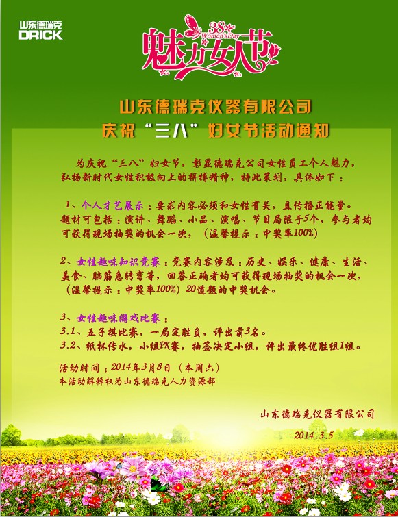 我国于1949年12月规定每年的3月8日妇女节,迄今为止已有60多年的历史,而今年恰逢是三八妇女节第65周年。为了活跃企业文化氛围,表彰和感谢女同胞们为公司做出的贡献,山东德瑞克仪器有限公司决定于3月8日为所有女员工准备了一系列别开生面的欢庆活动,在表彰和感恩的同时也为德瑞克女同胞们展示个人才艺,彰显女性风采提供了一个良好的舞台?;疃咛迥谌萑缦拢?/span>