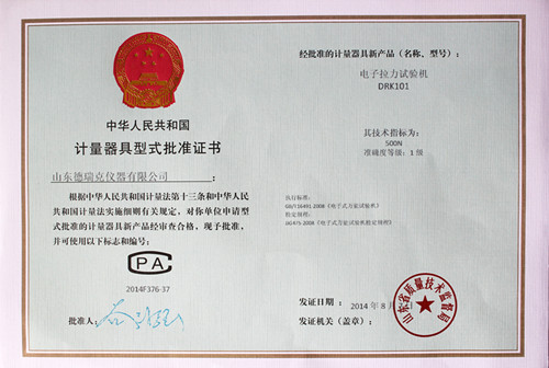 近日,德瑞克接到市局通知,在济南市质量技术监督局一楼计量器具型式许可证窗口领取到了电子拉力试验机型式批准证书(证书编号2014F376-37),加上之前领取的电子式抗压试验机(证书编号2014F277-37)、电子式压缩试验仪(证书编号2014F278-37)的型式批准证书,至此,德瑞克涉及的国家法定监管的计量产品已全部获得证书。
