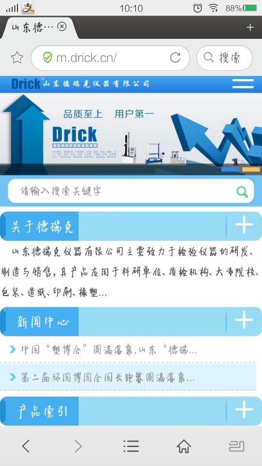 山东德瑞克作为引领创新技术的领导者,一直不断的创造新技术,挖掘新技能,学习新知识;“不断创新”贯穿着德瑞克公司的发展历程。我们秉承“客户满意是我们永无止境的追求”的服务准则,为方便客户更快速,更便捷的了解我们的产品,2015年新年伊始,特推出手机网站“m.drick.cn”“m.jndrktest.com”“m.worlddrick.com”供大家浏览,为全球客户提供检测仪器行业最新资讯,最新发展方向。
